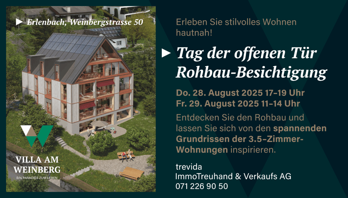 Wir laden Sie herzlich zur Rohbau-Besichtigung in Erlenbach ein. Entdecken Sie die zeitlose Architektur, lassen Sie sich von den lichtdurchfluteten 3.5-Zimmer-Wohnungen inspirieren und geniessen Sie den Ausblick auf den Zürichsee.
